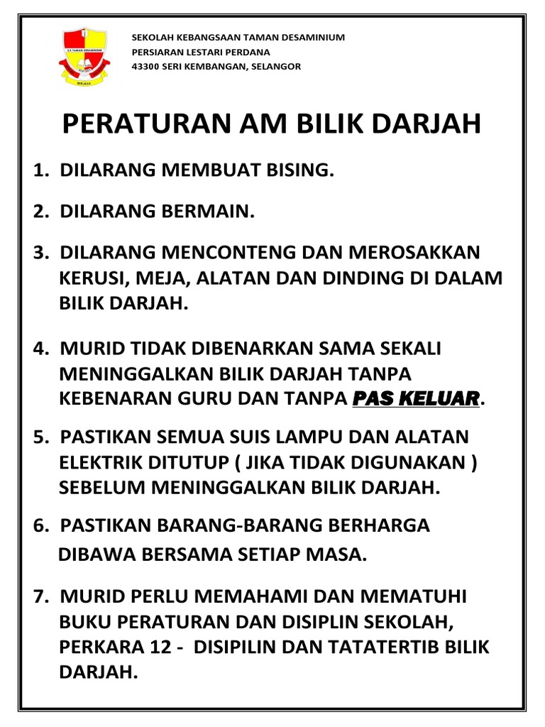 Kebersihan Sekolah dan Bilik Darjah. 710 am hingga 1200 pm. 23 Perkarakawasan Larangan 231 Kawasan Sekolah Rendah dan Menengah 2311 Pelajar-pelajar tidak dibenarkan merayau-rayau dan mengotori kawasan sekolah rendah.