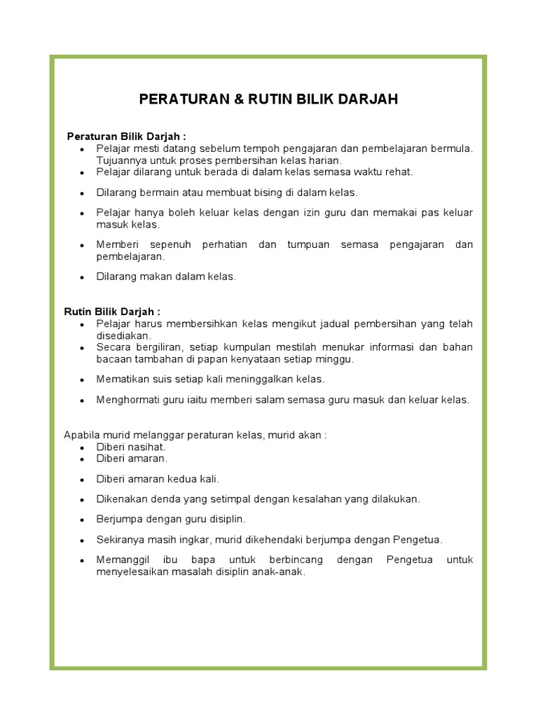 Satu salinan peraturan sekolah hendaklah dipamerkan di tiap-tiap bilik darjah di bilik guru dan juga di papan. ANIS AINA BINTI ZINUDIN Pembentukan peraturan Menurut buku Siri Pendidikan Guru Pengurusan Bilik Darjah karya Haliza Hamzah Joy Nesamalar Samuel peraturan membawa maksud kenyataan yang memaklumkan tingkah laku yang boleh diterima di dalam bilik darjah. Satu salinan peraturan bilik darjah hendaklah dipamerkan pada papan notis supaya murid dapat membaca.